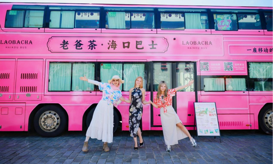 外国游客打卡老爸茶海口巴士。海南省旅游和文化广电体育厅供图