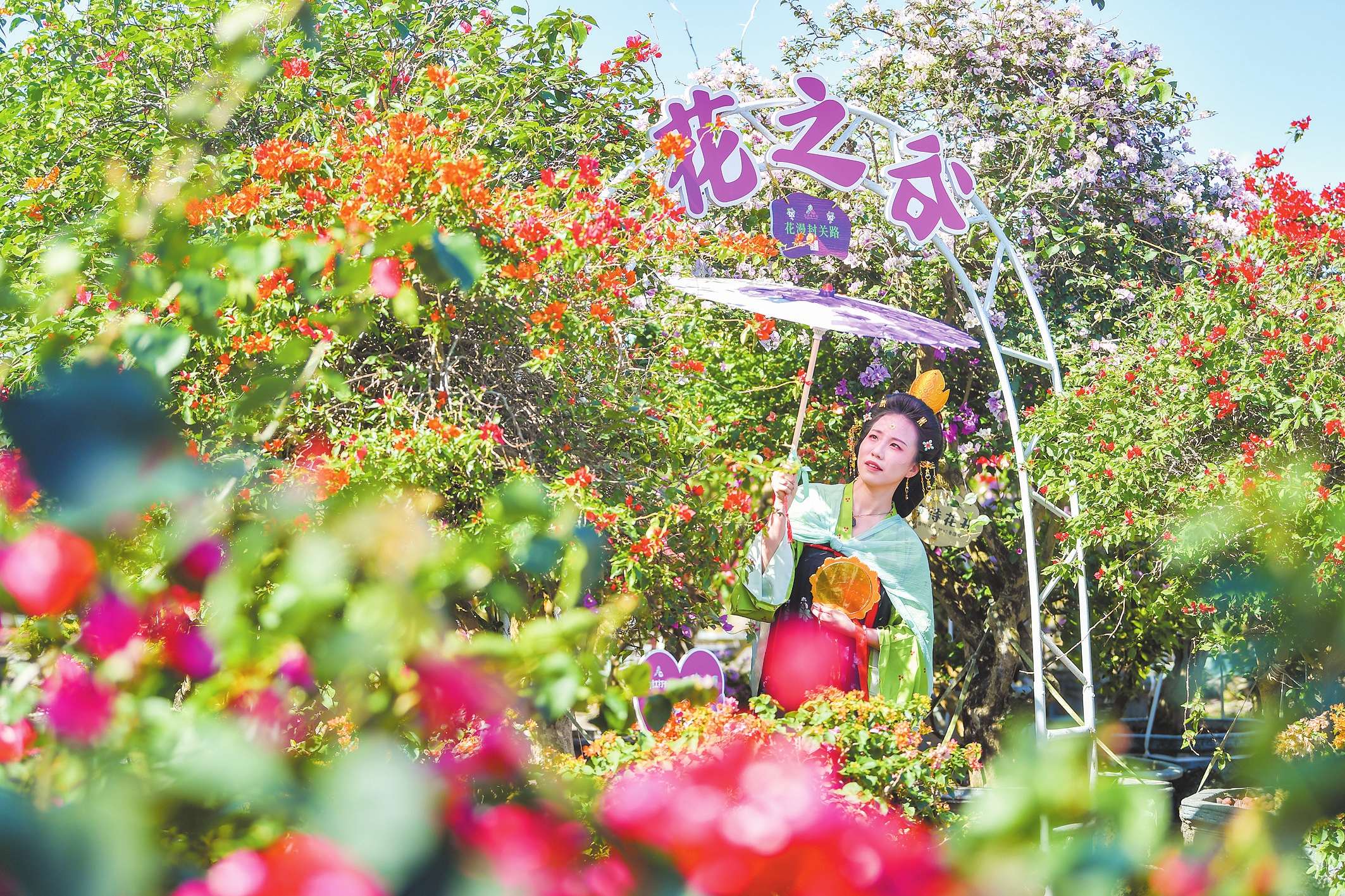 12月21日,“三角梅赏花周”在琼山区红旗镇边洋村三角梅共享农庄开幕。图为市民游客在此打卡拍照。本报记者 苏弼坤 摄
