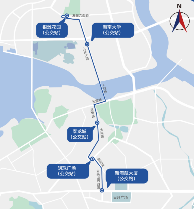 专线二:银滩花园(公交站)——海南大学(公交站)——泰龙城(公交站)——明珠广场1号站(公交站)——新海航大厦(公交站)