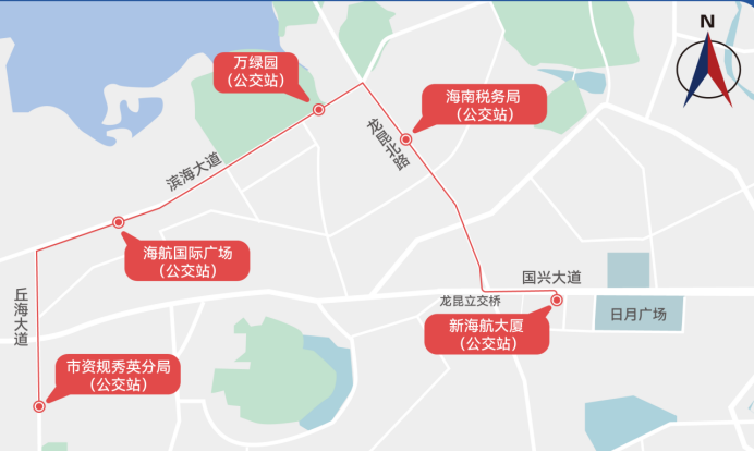 专线一:市资规秀英分局(公交站)——海航国际广场(公交站)——万绿园(公交站)——海南税务局(公交站)—新海航大厦(公交站)