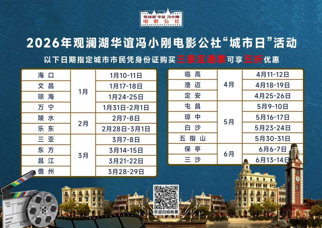 2026年观澜湖电影公社“城市日” ,每个周末,都会有一个海南市县的市民朋友享受专属5折福利,全省轮动。在“海口市民日”之后,将迎来 “文昌市民日”,具体活动安排及后续市县日期,请持续关注 “观澜湖电影公社”官方服务号,获取最新资讯!