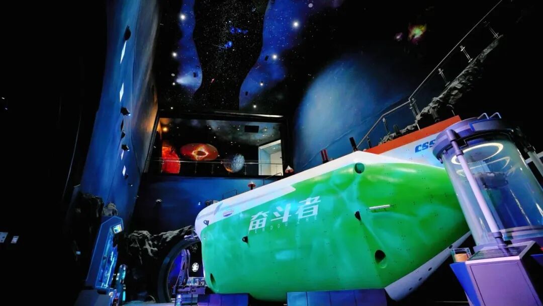 接着是四楼。四楼的“深海探秘”可以说是技术含量最高的。展厅内设有国内首个1:1.2比例的“奋斗者”号潜水器模型,能走进舱内,配合MR混合现实,模拟从海面下潜到万米深渊。