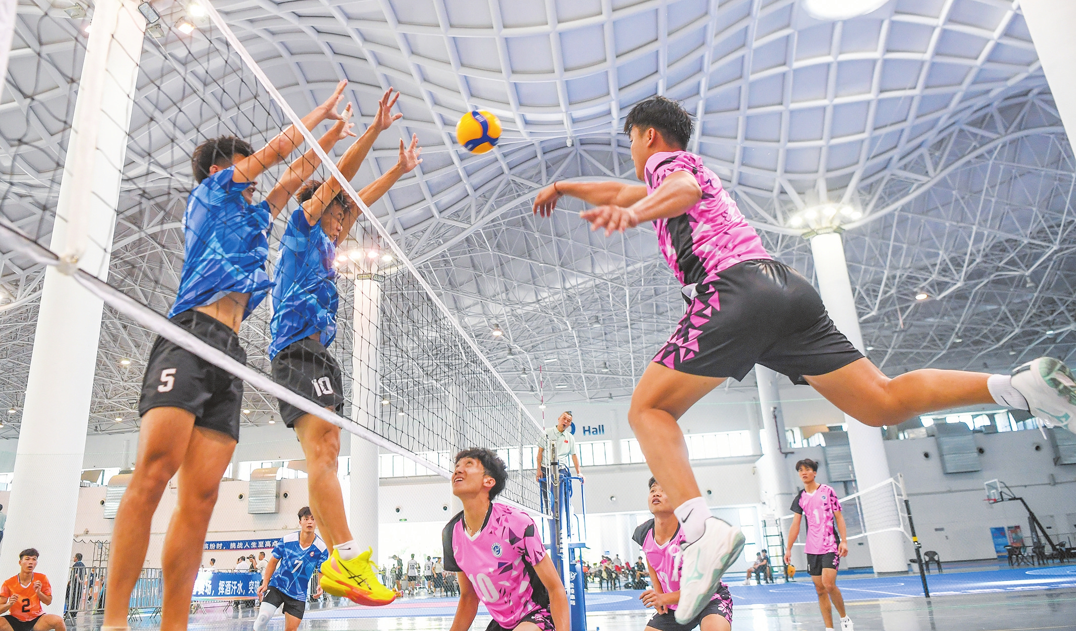 2025年海南省大中学生排球赛中,参赛选手进行激烈对抗。本报记者 康登淋 摄
