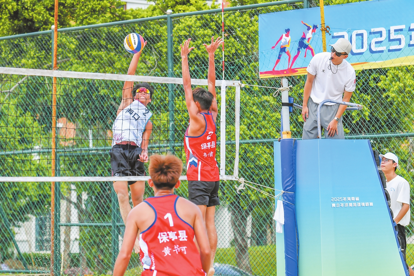 2025年海南省青少年沙滩排球锦标赛在海口经济学院开打,学生运动员们全力以赴展开比拼。本报记者 孙士杰 摄
