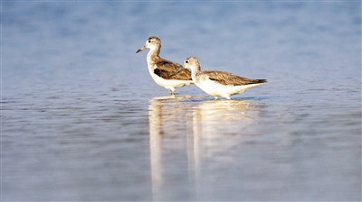 湿地浅滩上,黑翅长脚鹬迈着标志性的红色细腿,低头在水中扫动长嘴觅食,一举一动尽显“红腿娘子”的曼妙。忽而一阵振翅声划破静谧,黑尾塍鹬率先盘旋升空,紧接着一群“翘嘴精灵”闯入视野,正是国家“三有”保护动物反嘴鹬。它们身着黑白相间的“斑马纹华服”,淡蓝灰色的大长腿修长挺拔,独特的上翘长嘴是辨识度拉满的“专属标志”,在水面或扫或啄,将小鱼、贝类等美食收入囊中,姿态优雅又灵动。