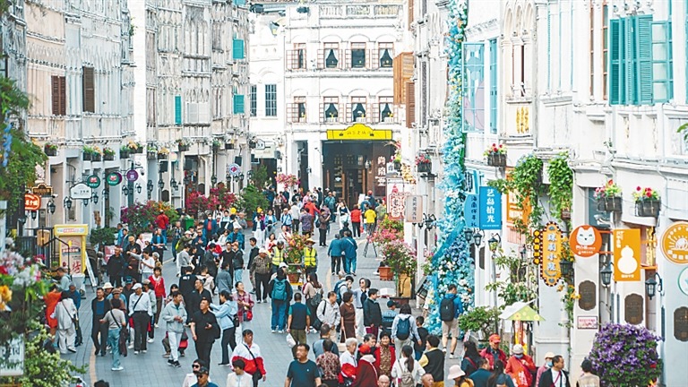阳光穿过雕花的连廊,在青石板路上落下斑驳的光影,百年南洋风格的骑楼建筑下,各地游客穿梭其中,尽享热闹鲜活的氛围,传统老字号与潮流商铺比邻而立,碰撞出独特的城市烟火气。
