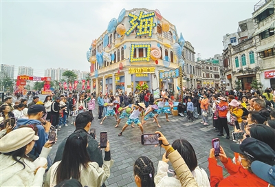 街区内,一场充满海南特色的快闪表演火热上演。表演者身着花短裤、头戴特色斗笠,活力十足的舞姿吸引众多游客驻足围观,大家纷纷举起手机记录精彩瞬间。