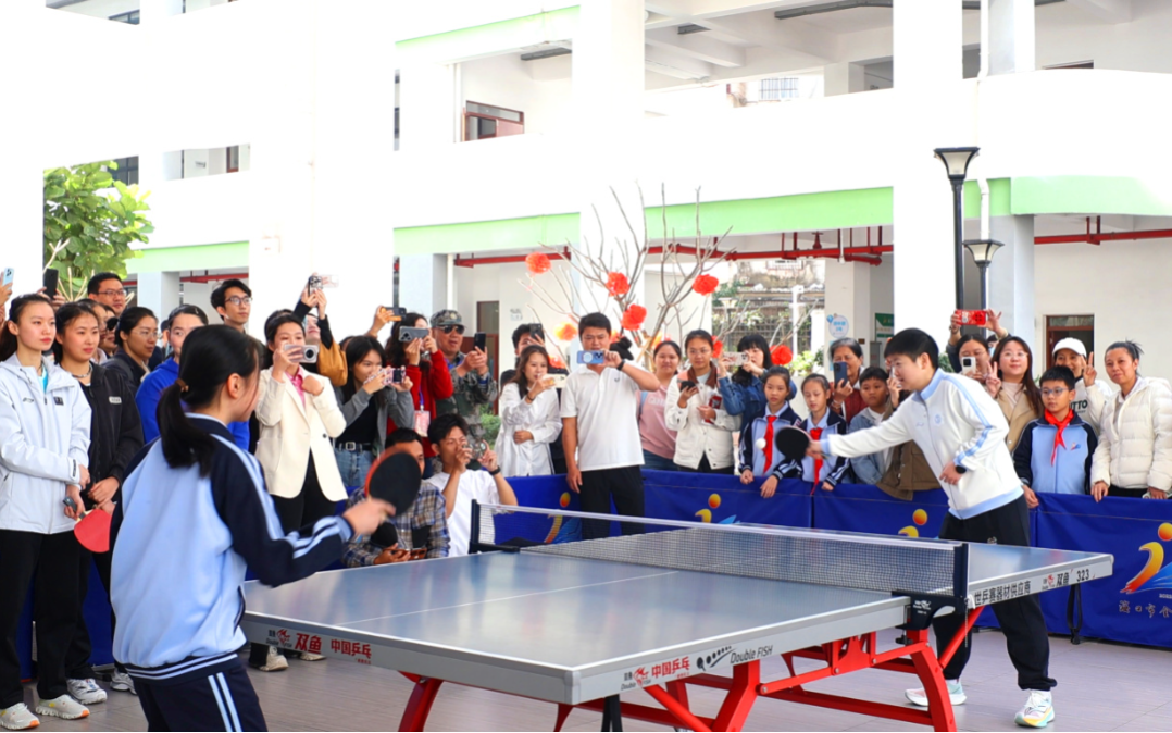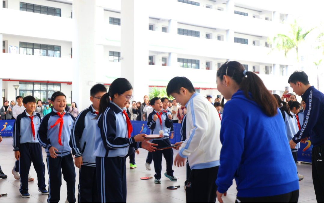 在人大附中海口实验学校,王楚钦等国手与师生们进行趣味互动和轻松愉快的友谊赛,让冠军与乒乓爱好者零距离接触,生动演绎了“榜样就在身边”的感染力。