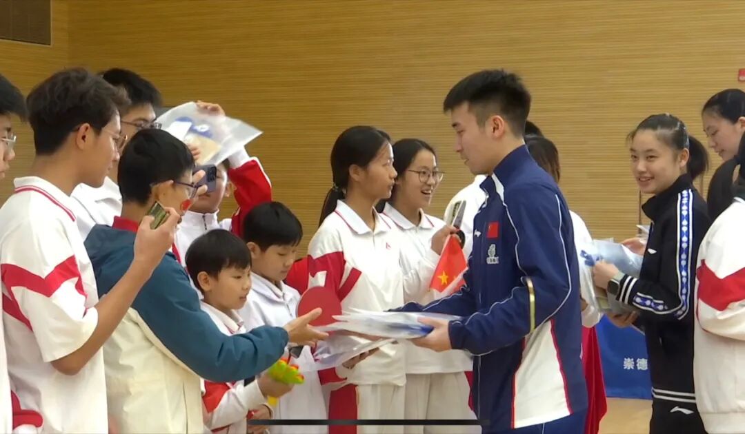 随后进行的友谊赛中,王楚钦与该校一名高中生隔网对垒。王楚钦寄语孩子们,无论未来是否走上职业体育道路,乒乓球都能带来快乐与成长,鼓励大家勇敢逐梦。