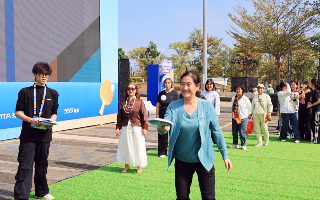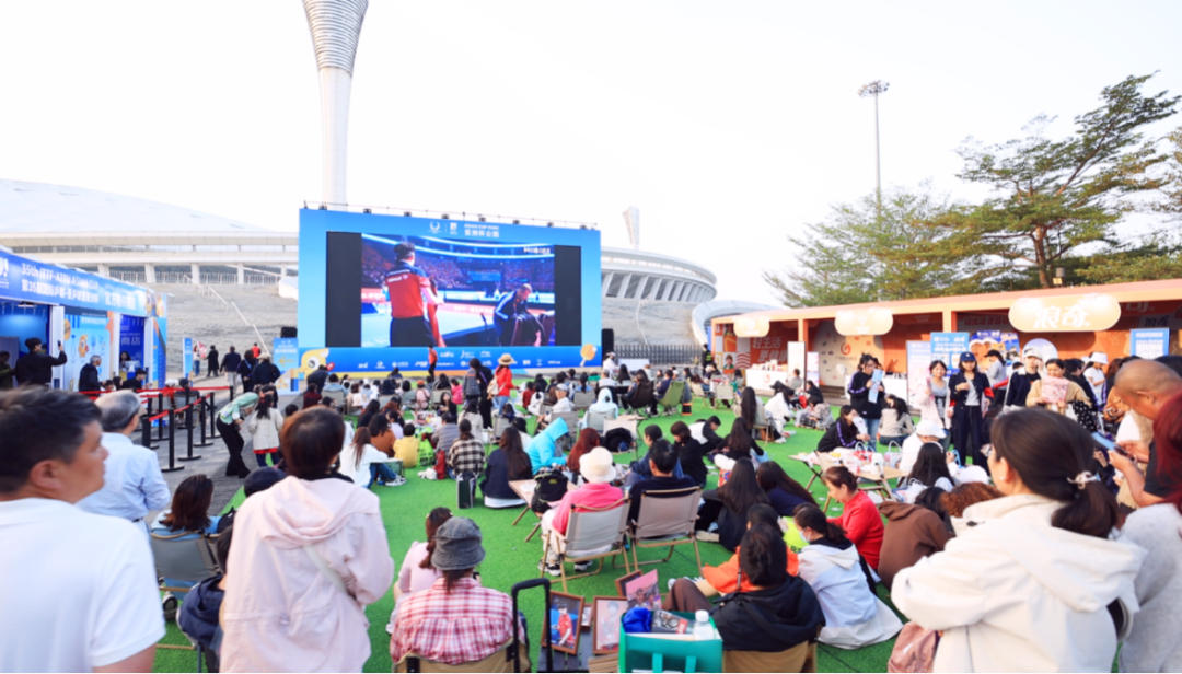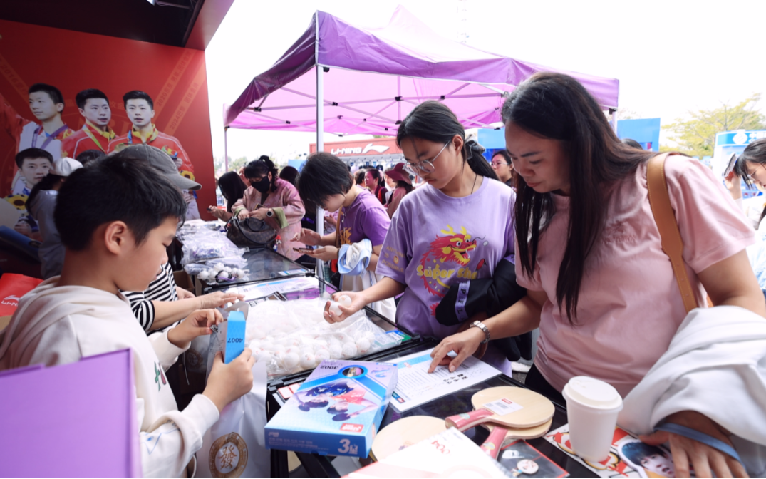 入口处的巨型乒乓球艺术装置与萌趣的吉祥物“亚洲宝宝”气模吸引众多观众合影留念。许多家庭观众和孩子在“敢乒你就来”智能发球机前排起长队,体验着乒乓的独特乐趣;“乒乓过河”等趣味游戏区则传来阵阵欢声笑语;手持集章地图的球迷穿梭于各品牌互动区完成集章任务,兑换限定礼品。官方特许商品区人气高涨,吉祥物衍生品备受青睐。