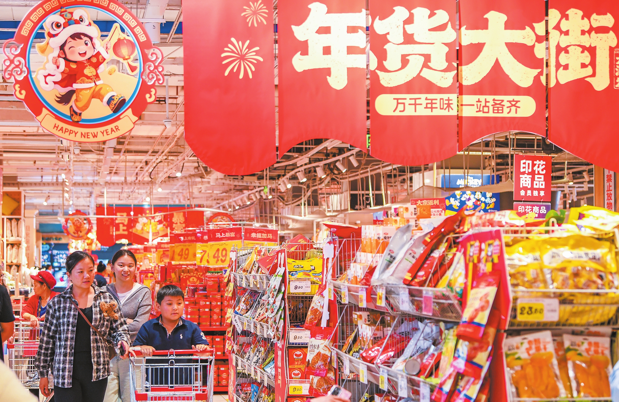 海口大润发国兴店更新展陈,营造出红火的新春氛围,市民在其中挑选年货。
