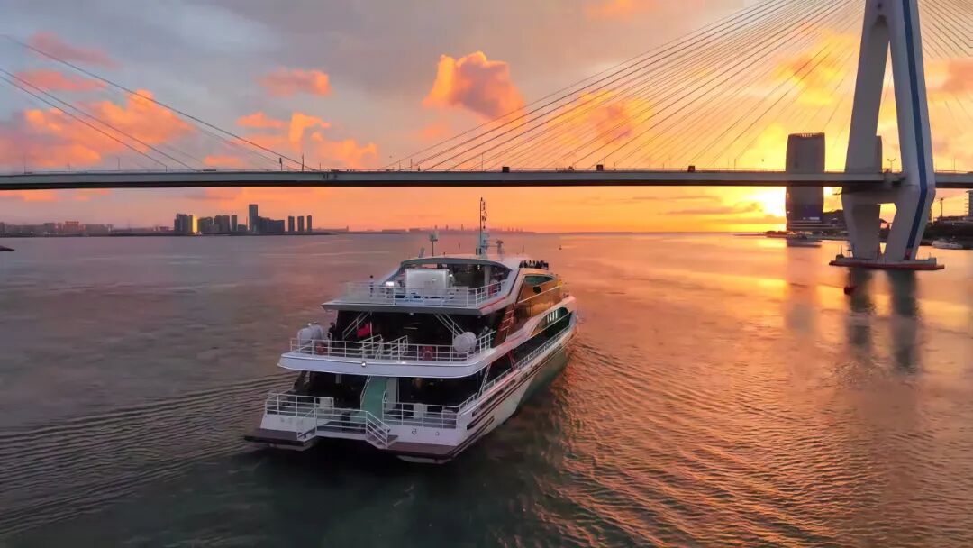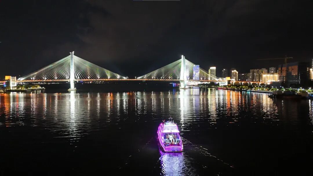 傍晚时分,歌声与海浪交织,乘“美兰1号”或“海旅1号”游船夜游,开启海上赏夜景的浪漫之旅。游船缓缓驶出码头,两岸的灯光逐渐亮起,海口湾大桥的灯光像一条金色的项链,缠绕在海面上,远处的高楼大厦闪烁着霓虹,整个椰城的夜晚都变得温柔起来。
