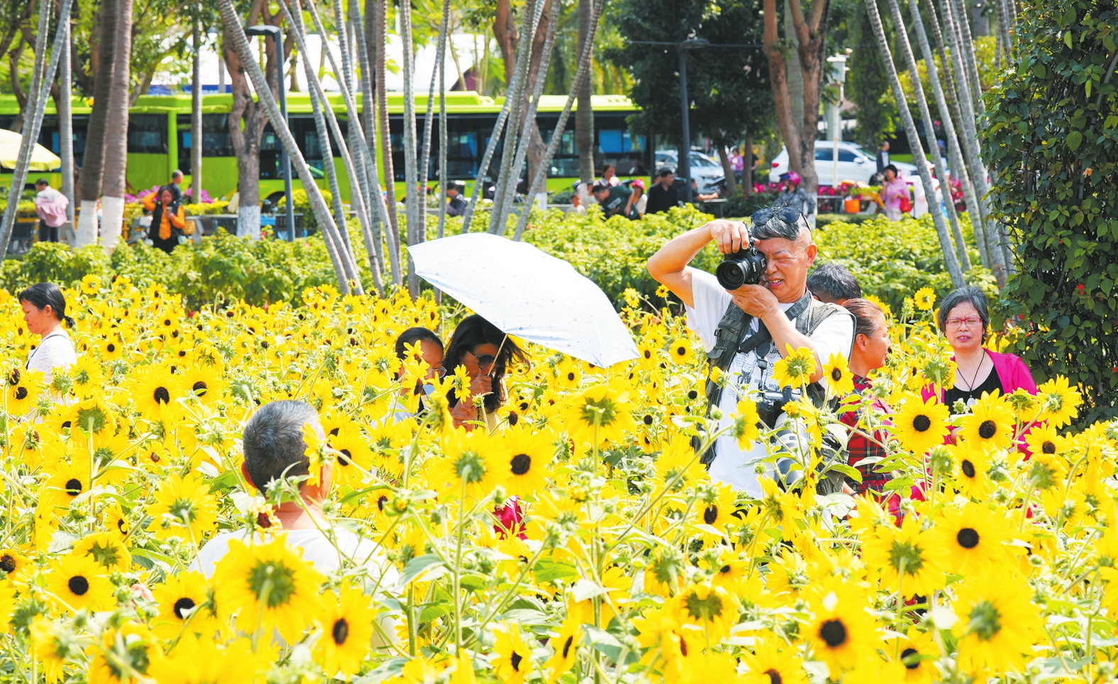 2月22日,海口万绿园向日葵花开正艳,市民游客慕名前来打卡。本报记者 杨忠凯 摄