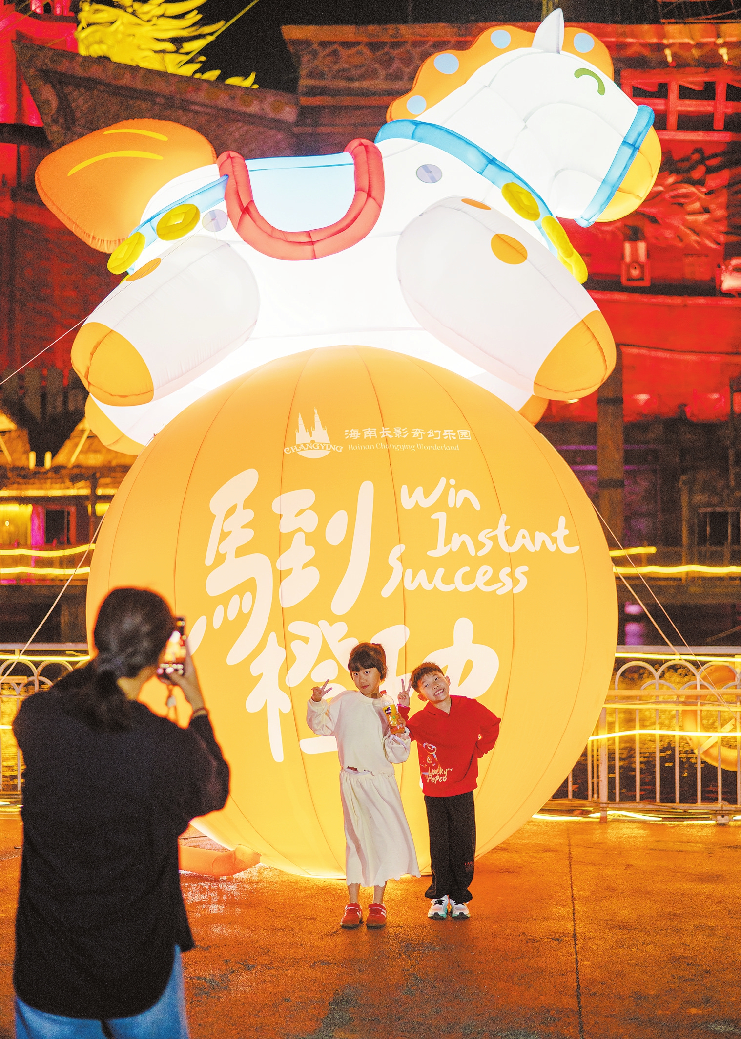 2月22日,在海南长影奇幻乐园,游客与马年灯饰合影。本报记者 石中华 摄