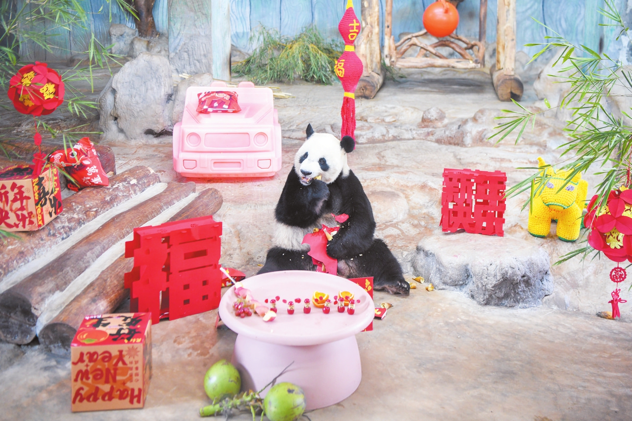 2月21日,海南热带野生动植物园内年味浓,工作人员专门为熊猫舜舜准备了丰盛的“春节大餐”。 本报记者苏弼坤 实习生陈新锐 摄
