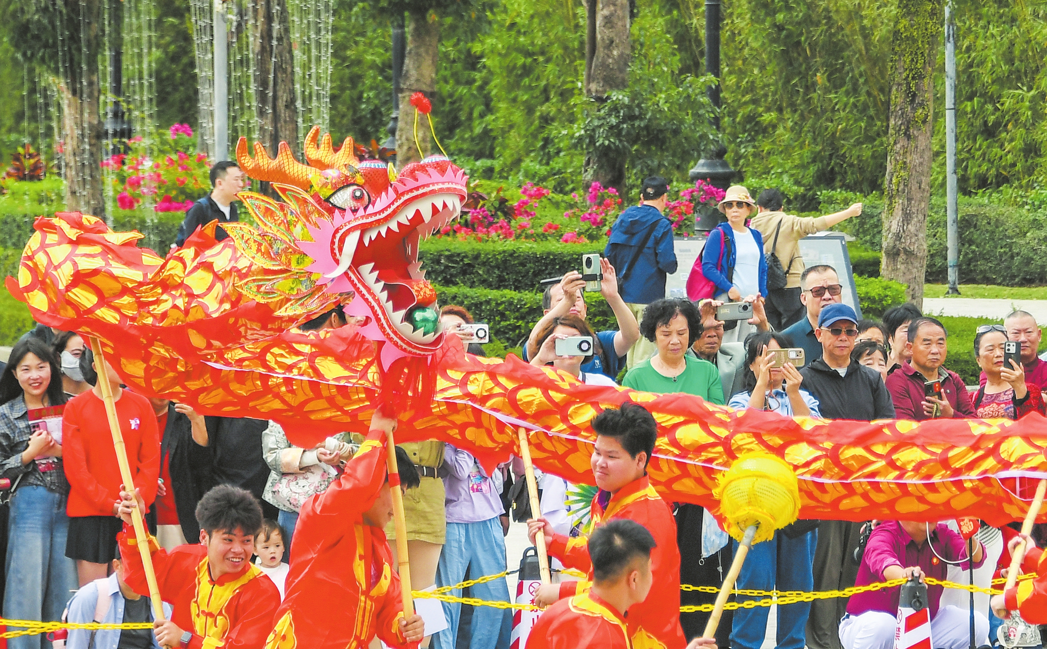2月19日,海口观澜湖电影公社的舞龙舞狮表演,吸引众多市民游客拍照记录。本报记者 康登淋 摄