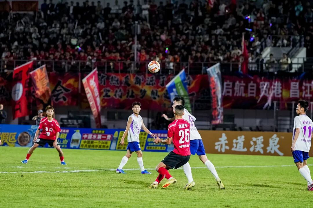 落后的海口队迅速稳住阵脚,快速展开猛烈反扑。球员们频频冲击对方禁区。第30分钟,海口队底线附近传中,18号陈焕鑫抓住机会,高高跃起,抢在守门员之前将球打进。场上比分扳为1:1!这粒进球如同强心针,瞬间点燃了全场数万球迷的热情,呐喊声、助威声此起彼伏,将夜色中的海口彻底点燃。