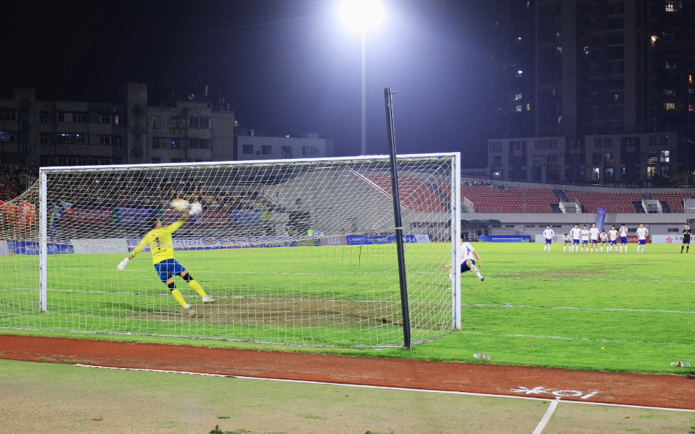 即便如此,海口队的将士们没有被击垮。他们再次组织攻势,险些在常规时间绝杀对手,接近比赛尾声,海口队一脚极具威胁的射门狠狠击中横梁弹出,皮球擦门而过,与进球咫尺之遥!这一刻,现场空气仿佛凝固,遗憾与惋惜写满了每个人的脸庞。最终比分定格在1:1,残酷的点球大战成为了决定胜负的唯一途径。