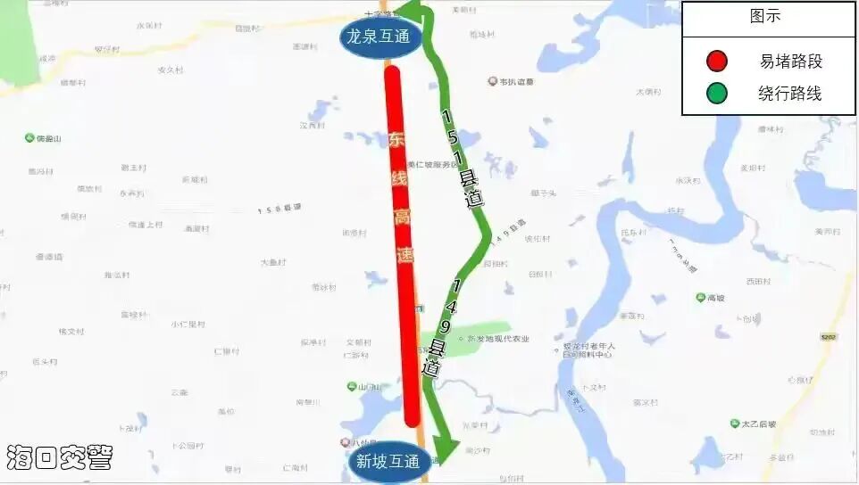 如东线高速龙泉互通至新坡互通车流量大,建议途经车辆绕行151县道⇆149县道。