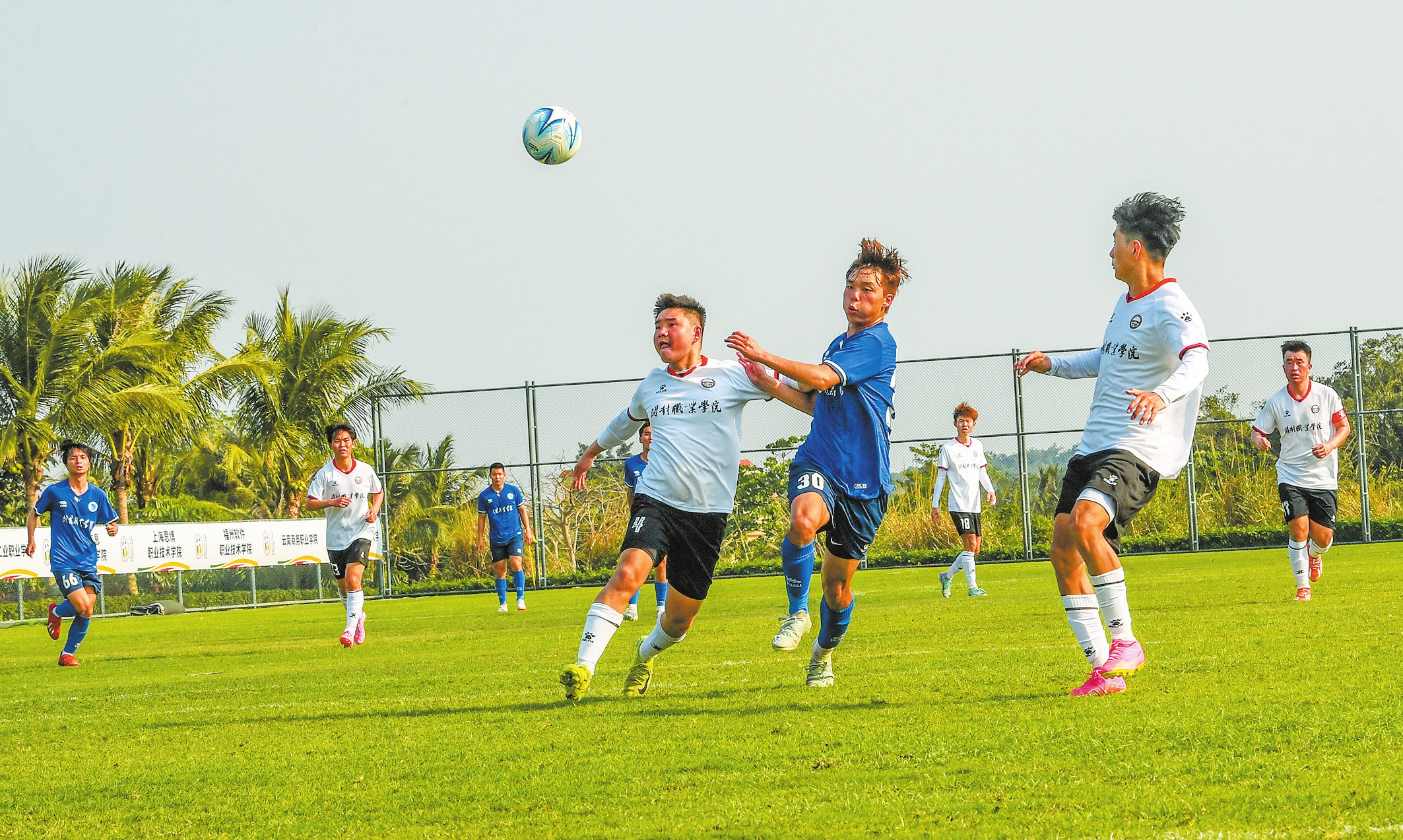4月8日,2025-2026全国青少年校园足球四级联赛大学男子丙组全国总决赛在海口观澜湖拉开帷幕。图为参赛选手在比赛中激烈角逐。本报记者 康登淋 摄