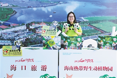 在海口展厅,海南热带野生动植物园工作人员在展示文创产品。