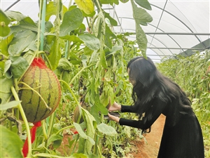 海口龙华区果果都市农庄的农业体验区,大棚内藤架上挂着个头圆润饱满的小西瓜。 本报记者 史瑞丽 摄