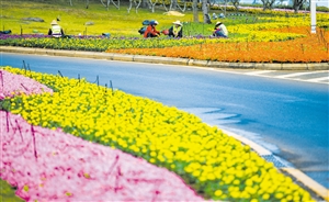 连日来,在国兴大道与海府路交叉口处已是鲜花绽放醉游人。 本报记者 苏弼坤 摄