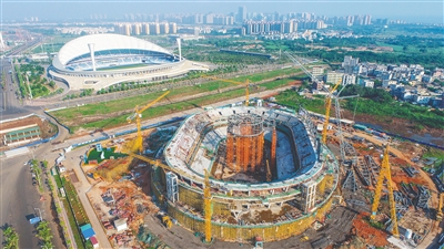 俯瞰雏形初现的海口五源河文体中心二期项目。目前,该项目总进度已过半,预计2021年12月底竣工交付。 五源河文体中心二期项目建设内容包括体育馆、游泳馆和网球馆,其中体育馆建设总投资10.9亿元,该项目完工后具备举办全运会等全国性以及单项国际比赛条件。