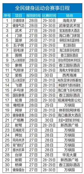新海南客户端、南海网、南国都市报8月26日讯,8月26日,参加2021年第十三届海南省全民健身运动会的全省各市县、洋浦经济开发区、行业体协、省级行业协会、国有企业共34个代表团陆续抵达海口。目前,群众比赛项目和健身擂台项目的比赛日程已出炉。