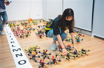 工作人员将检验合格的穿越机按比赛排序统一放置。