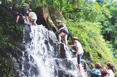 游客在呀诺达雨林文化旅游区体验“踏瀑戏水”拓展活动。武昊 摄
