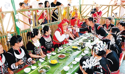 在黎族苗族同胞聚居的海南中部地区,“三月三”里对山歌、跳竹竿舞、吃长桌宴、喝山兰酒等习俗非常盛行。这一天,人们从四方汇集,用欢歌笑语和热烈舞蹈互诉衷肠,通过品尝美食佳肴来抒发心中的快乐。