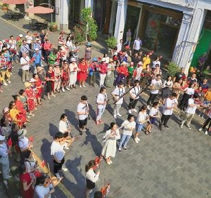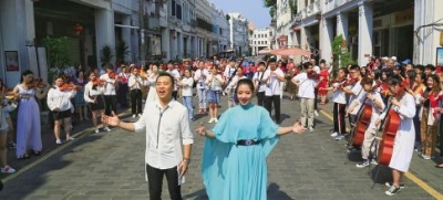 赵晓辰介绍,本次快闪活动的主题曲是将《万泉河水清又清》《久久不见久久见》《请到天涯海角来》《竹竿舞》四首海南经典乐曲进行精心设计并重新创作而成。
