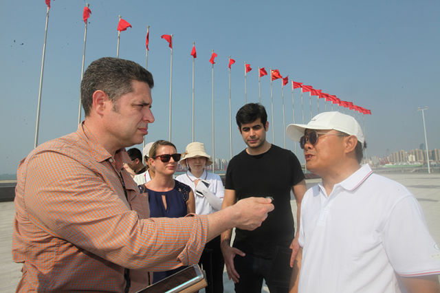 ↑外媒记者采风海口国家帆船帆板基地公共码头相关负责人。