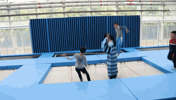 在蹦床上体验飞翔的快乐。
