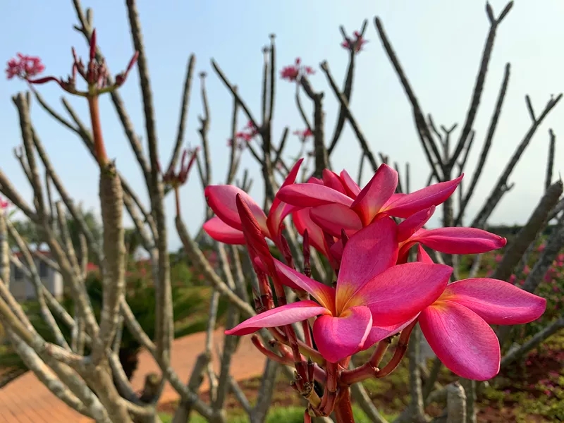 这里,鸡蛋花和三角梅互相衬托美如画。