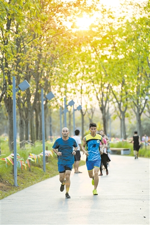 市民正在美舍河凤翔湿地公园锻炼身体。