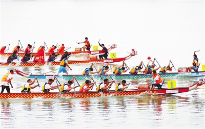 比赛时,站在金江岸边、南渡江大桥上,只见彩旗飘扬,耳边锣鼓喧天、人声鼎沸,数百米宽的江面上,赛龙舟的队伍似蛟龙出水,百舸争流,飞溅的浪花,与岸上沸腾的人群相映成趣,构成一幅幅乡情浓浓的龙舟竞渡图,让人热血澎湃。