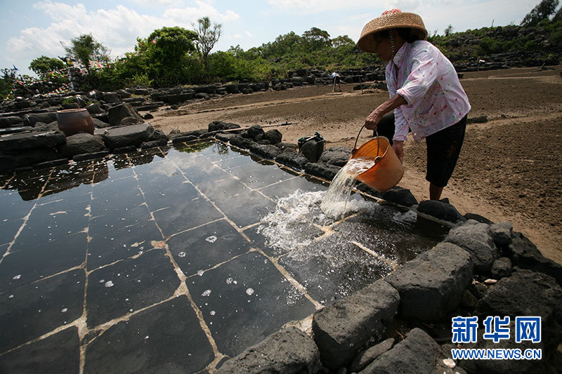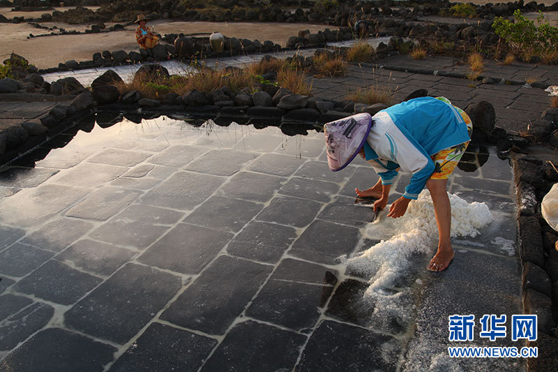 儋州峨蔓古盐田盐工劳作场景。新华网发(柯人俊 摄)
