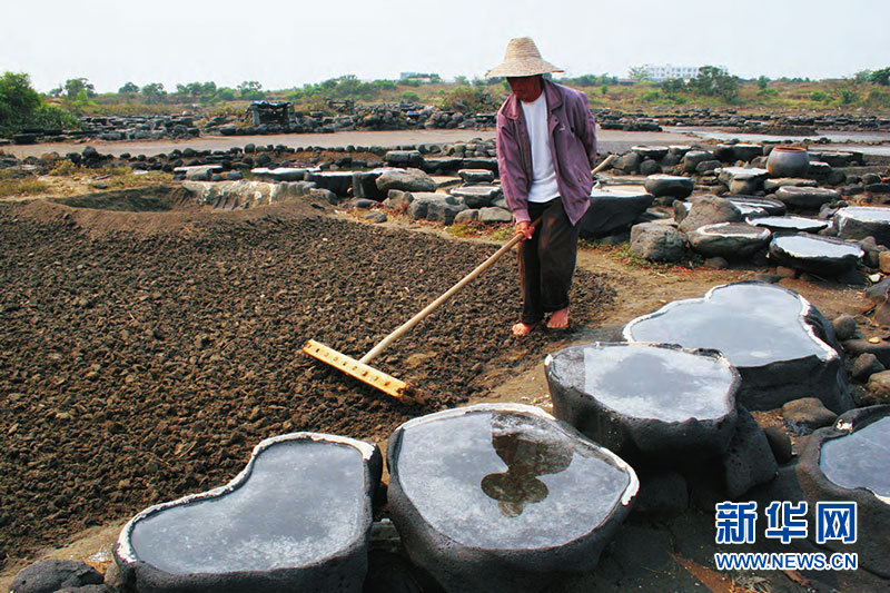 “涨潮时海水流入盐池浸泡沙泥,退潮后用木耙将盐泥耙松、晒干。”盐丁村最年长的盐工、83岁的李景威介绍,制盐要选烈日当空时,晒干后的盐泥耙成一堆,放进铺有芦苇和稻草的过滤池里,用脚踏实,浇海水冲洗过滤,留下含盐量很高的饱和卤水,再把卤水倒在石盐槽上,经过半日风吹日晒,结晶后就变成了雪白的盐巴。