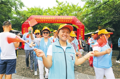 6月15日,在海口石山火山群世界地质公园,2019海南暑期旅游推广与消费活动新闻发布会暨美丽海南旅游文化季启动仪式举行。左图为仪式上的舞蹈表演,上图为参加仪式的徒步爱好者徒步出发前挥舞五星红旗。 本组图片均由 本报记者 张茂 摄