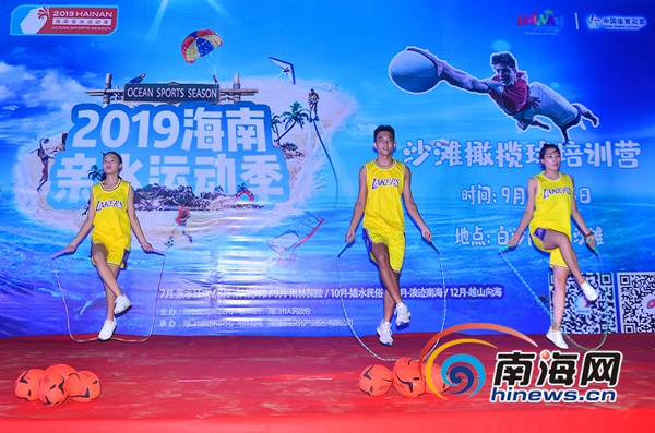 在当晚的沙滩橄榄球训练营活动开幕式上,来自海南省掷球协会、海南省跳绳运动协会、海南省街舞协会、海南省机器人运动协会的社会体育指导员们,表演了机器人运动《钢铁之路》、街舞《我们的青春》、花样跳绳节目等。