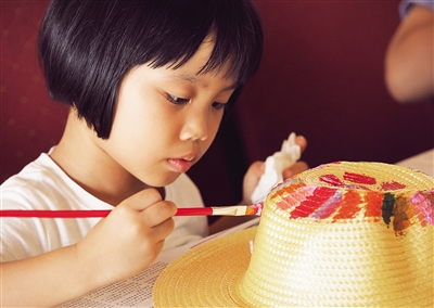 在亲子游活动中,一位小朋友在为草帽上色。 见习记者 封烁 摄