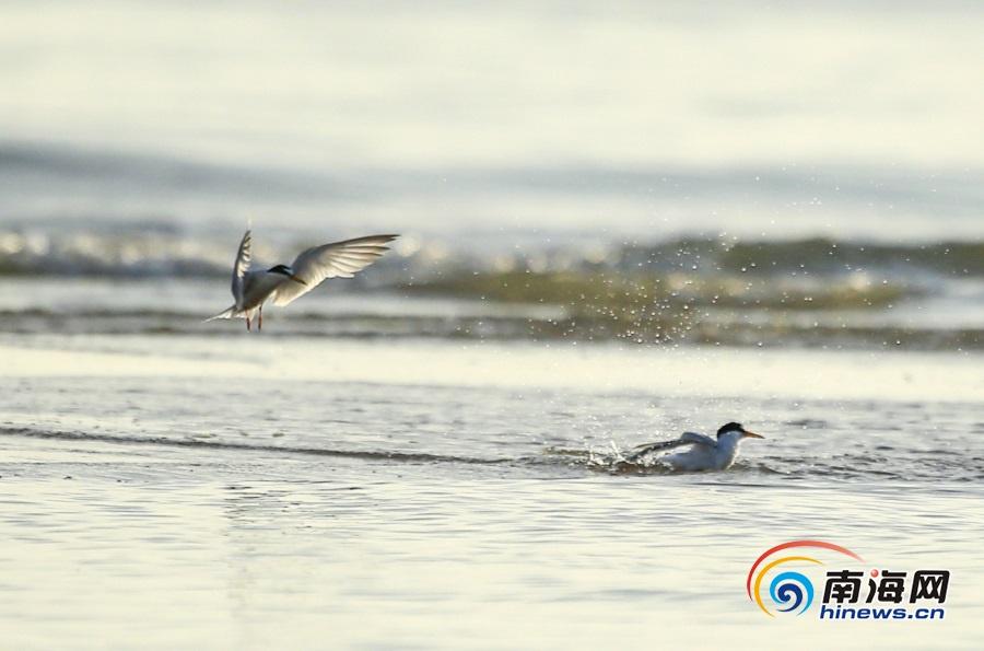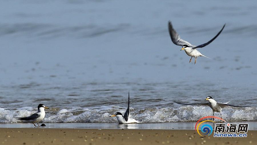 7月11日,在海口五源河国家湿地公园,成群结队的白额燕鸥在海滩上栖息觅食,集群飞舞场面壮观。