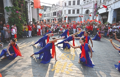 十月一日,海口骑楼老街举办的文艺节目吸引了众多市民游客。本报记者 王凯 摄