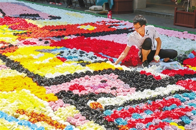 9月30日,工作人员在布置花毯。 见习记者 李天平 摄