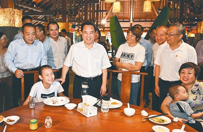 正值庆祝新中国成立70周年,海南各地洋溢着欢乐、祥和、喜庆的节日气氛。有着“中国历史文化名街”之称的海口骑楼老街热闹非凡,古色古香的南洋风格历史建筑,琼剧等非遗文化展演,各种“文艺范”十足的旅游商品店、餐厅、咖啡馆、艺术空间等店铺,加上国庆主题的歌舞快闪和街头艺术表演,吸引了大批游客。刘赐贵一行也加入欢乐的人群,与游客一起观看展演、亲切交流。刘赐贵指出,文化是旅游的灵魂,要打造更多具有文化内涵、彰显海南特色的旅游吸引物,大力推动文化消费。要规范旅游市场秩序,加强宣传推介,提升服务水平,加强市场监管,做好游客流量监测和引导,确保旅游市场秩序井然、运行平稳。