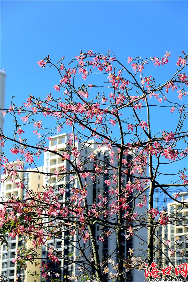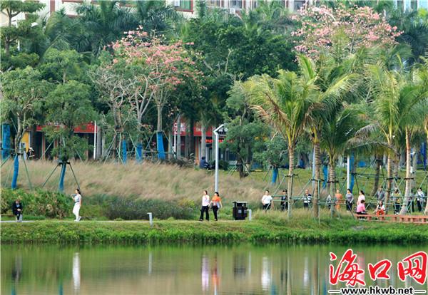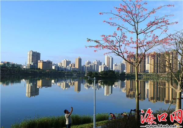 初冬的海口市红城湖水清岸绿,暖阳如春,环湖的异木棉花此时正竞相绽放,争奇斗艳,在蓝天白云的映衬下异常美丽,让不少路人忍不住放慢脚步,用手机留下这最美的一刻。(吴印)