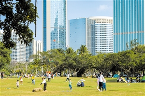 ②在海口万绿园,市民游客搭起帐篷享受露营生活。