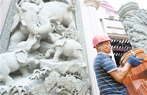 近日,美兰区白沙门上村兴潮天后宫正在修缮中。其中,寓意团结、融洽与和谐的大象石雕构件非常精美,让人眼前一亮。整个天后宫像这样精美的石雕和木雕有几十件之多,看起来犹如一个传统雕塑博物馆。据了解,白沙门上村兴潮天后宫由福建兴化府、广东潮州府客商捐建。始建时间不详,曾在清乾隆二十年和清嘉庆十八年两次重修。2019年,兴潮天后宫被列为海口市重点文物保护单位。